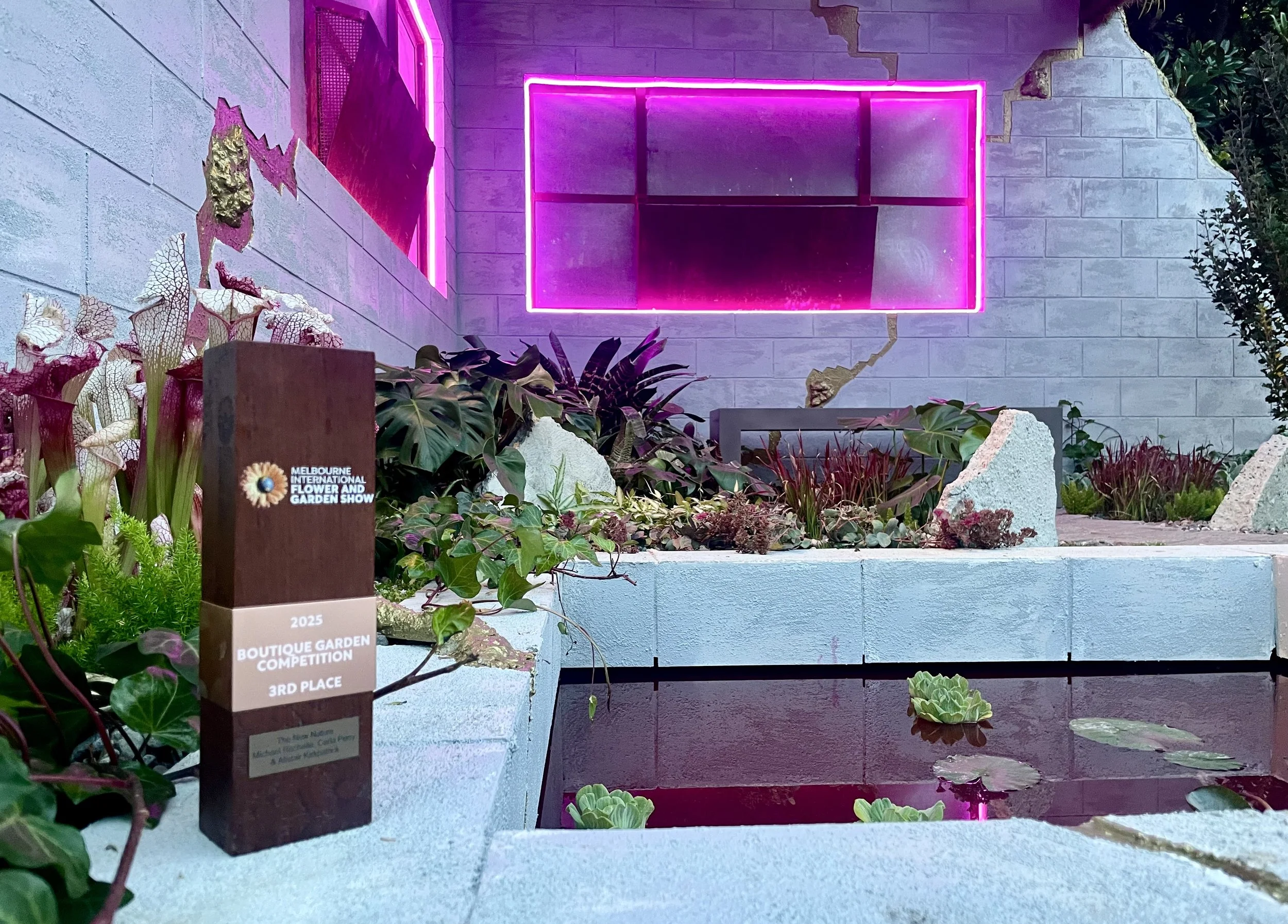 Winning Bronze in the 2025 Boutique Garden Competition at the Melbourne International Flower & Garden Show, the garden was a collaboration between Alistair Kirkpatrick, Carla Perry Gardens, and Michael Rochelle Landscapes; built in partnership with Innerbloom Landscapes. Together, we sought to challenge perspectives, using plants as both medium and message to explore hope in our inevitable hybrid future landscapes.